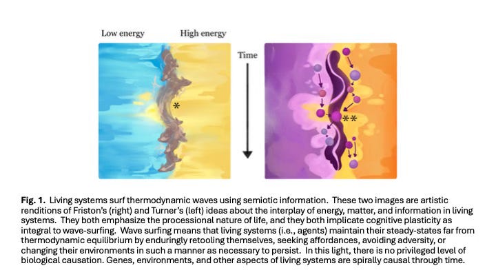 Both Friston’s and Turner’s models reference free energy as the disparity between a system’s current state and a reference state, though Friston emphasizes informational differences while Turner focuses on chemical or energetic conditions (Fig. 1). Both envision non-equilibrium systems encased by barriers allowing bidirectional flows, with systems continually updating themselves in response to new environmental information. Crucially, both models also emphasize reciprocal causality (Svensson 2018, Mitchell 2023): that systems shape their environments, which in turn shape future system responses. Fig. 2 depicts critical aspects of such systems.