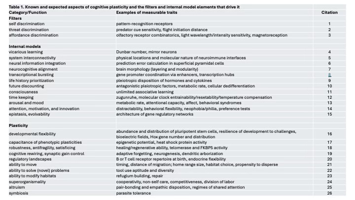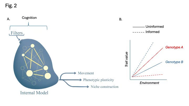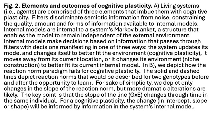 Here, like others, I define cognitive plasticity as the subset of plastic phenotypic traits arising from the dynamic interplay of information from the environment (Adami 2024) with a living system’s existing model of its world, including but not limited to its genes (Levin and Dennett 2020, Vanchurin et al. 2022, Watson and Szathmáry 2016). Cognitive plasticity thus emphasizes that many plastic traits are functional and of evolutionary consequence because they become differently adaptive through time. Ideas like this one have been proposed before (Baldwin 2018, Gottlieb 2002), but for the most part, this perspective is distinct from the dominant framework for understanding phenotypic variation and evolutionary change, the Modern Synthesis (Laland et al. 2014, Huxley 1942). The Modern Synthesis proposed that phenotypic diversity, including adaptation, is the outcome of genetic variation interacting with selection across generations. While broadly valid, this portrayal is very generic, and indeed does not capture the fundamental features of life (Walsh 2015, Laland et al. 2014, Feiner et al. 2024), that living systems are entangled sets of information-rich processes that exist far from thermodynamic equilibrium. The Modern Synthesis’ strong focus on genes has been very productive in the practical sense, but it has also led us, sometimes unintentionally, to ascribe to genes a causal power that exceeds their actual roles (Pigliucci 2007, Pigliucci 2010, Noble 2008). I think that this position is no longer defensible because as Sewall Wright said (Wright 1931) and Walsh and Sultan (2024) have recently reminded us that individual adaptability, not genes, is probably the chief object of selection.